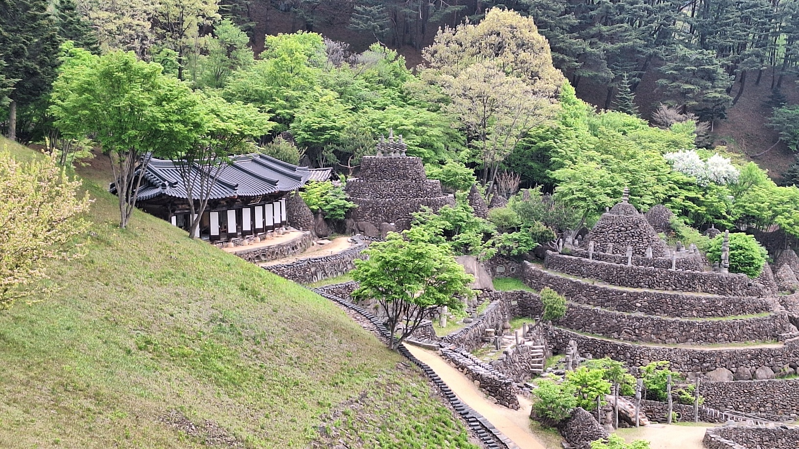 유래: 옛날부터 전해 내려오던 민속신앙 유적지로, 배달 민족의 시조인 환인·환웅·단군 삼신을 모시는 신성한 공간입니다. 선도를 이어받은 한풀선사가 수자들과 함께 수련하며 돌을 쌓아 올린 1,500여 개 돌탑이 주변의 숲과 어울려 이국적인 정취를 풍겨냅니다. 이 돌탑들은 이곳에서는 원력 솟대라 부릅니다. 삼한 시대에 천신께 제사 지내던 성지, 소도에는 보통 사람들의 접근을 금하려 높은 나무에 기러기 조각을 얹은 솟대로 표시했는데요. 성황당에 기원을 담듯, 소원을 빌며 지리산 자락의 돌로 솟대를 쌓아 옛 소도를 복원하고 있습니다. 3,333개의 솟대를 쌓아 성전을 이루고 우리 민족 고유의 정신문화를 되찾아 홍익인간 세계를 이루고자 무예와 가, 무, 악을 수련하는 이들의 터전입니다. 자연과의 조화를 중시하는 전통 철학이 곳곳에 녹아 있으며, 수천 평에 달하는 넓은 터에는 석조 조각, 연못, 성곽, 신단 등의 유적이 자연스럽게 배치되어 있어 이색적인 분위기를 자아냅니다.
