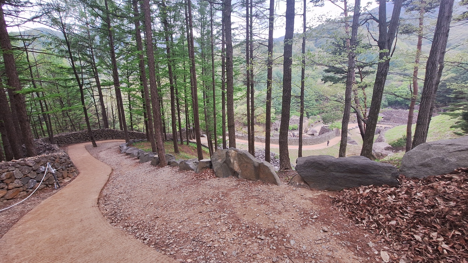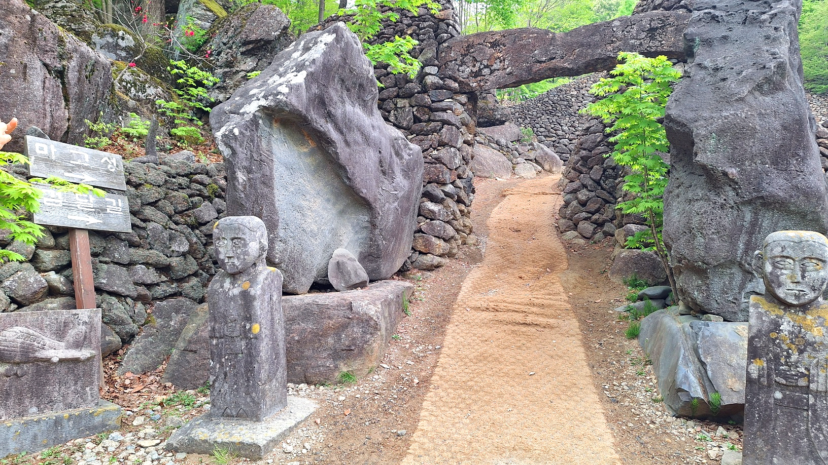 삼성궁의 매력 중 하나는 자연석을 이용한 조형물과 건축물입니다. 계단 하나하나, 담장과 성곽마저도 신중하게 쌓은 흔적이 느껴집니다. 마치 자연과 인간의 경계가 허물어진 듯한 느낌을 줍니다.