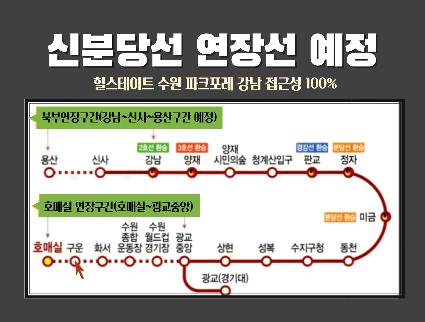 힐스테이트 수원 파크포레 인근은 다양한 교통 호재가 예정되어 있습니다. 우선 신분당선 연장선(광교~호매실)이 확정되었고, 구운역 신설이 구체적으로 추진 중입니다. 구운역이 신설될 경우, 해당 단지와의 거리는 도보 12분, 약 900m로 광역 교통 접근성이 획기적으로 개선됩니다.