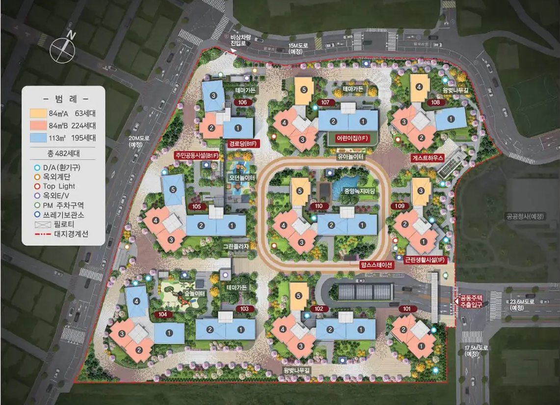 총 10개 동, 약 500세대 규모로 조성되었으며, 1.44대/세대의 넉넉한 주차공간을 제공합니다. 동간 간격도 여유롭게 배치되어 있으며, 행정복지센터 예정지가 단지 바로 앞에 위치해 있어 생활 편의성이 매우 높습니다.
