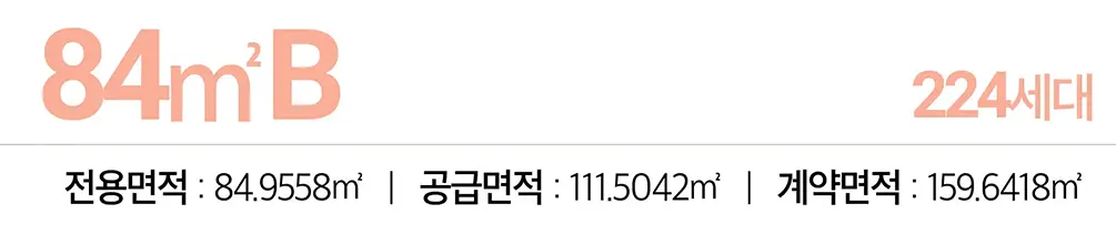 전용면적 84㎡는 판상형 A, 타워형 B 두 가지 구조로 나뉘며, B 타입 세대 수가 더 많습니다. 113㎡의 대형 평형도 공급되어 대가족 거주자에게도 적합합니다.