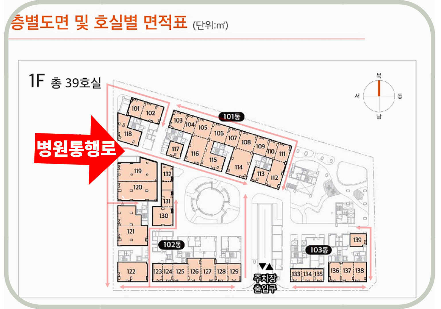 이 상가는 병원과 직접 연결되는 통로를 보유하고 있어 실질적으로 병원 상가로 활용되며, 진료 대기, 입·퇴원, 방문 고객들의 소비가 일상적으로 발생합니다.